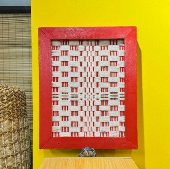 Handwoven threads on wooden frame using the twill pattern inspired by Binakol Kusikos.